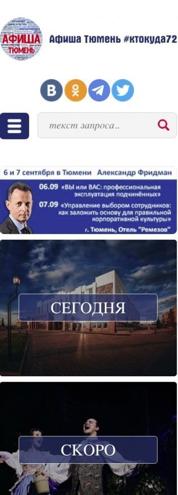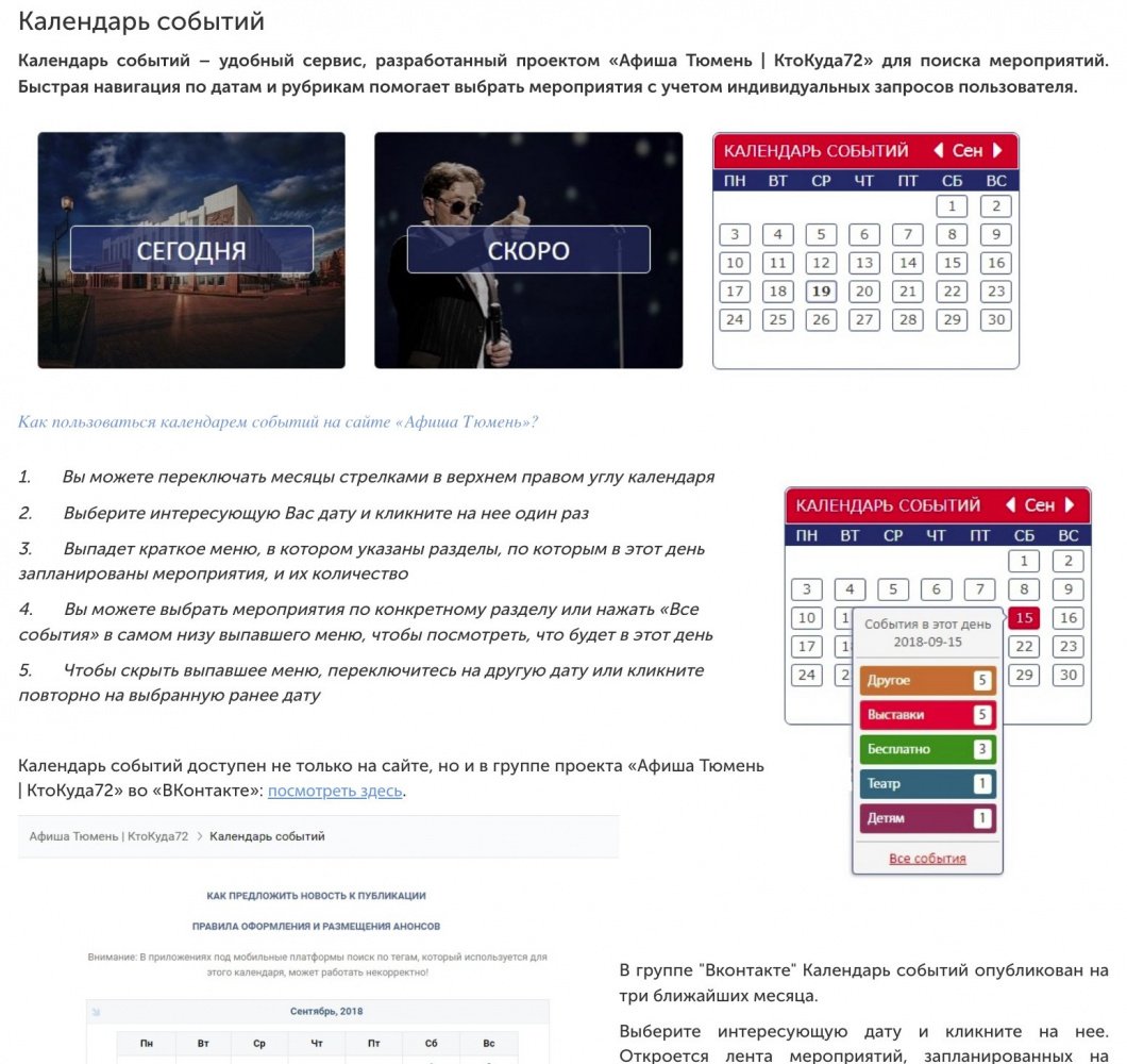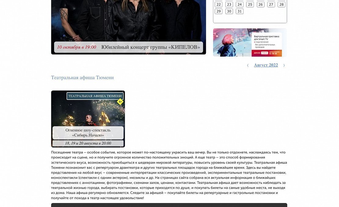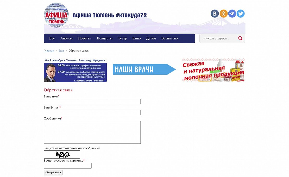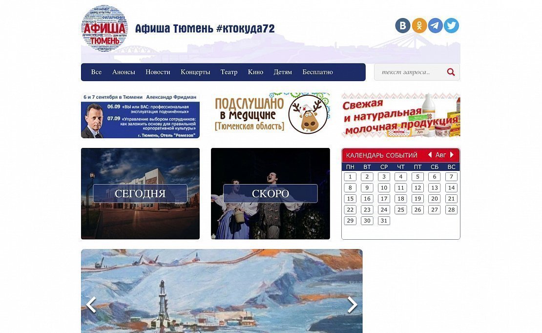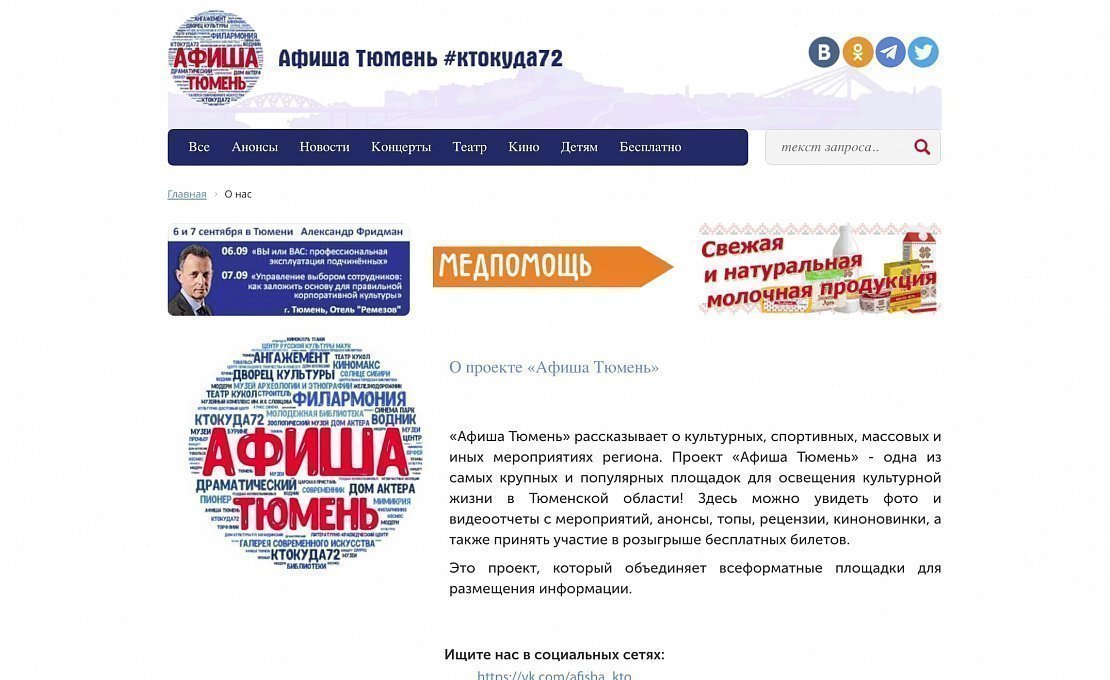 «Афиша Тюмень» рассказывает о культурных, спортивных, массовых и иных мероприятиях региона. Проект «Афиша Тюмень» - одна из самых крупных и популярных площадок для освещения культурной жизни в Тюменской области! Здесь можно увидеть фото и видеоотчеты с мероприятий, анонсы, топы, рецензии, киноновинки, а также принять участие в розыгрыше бесплатных билетов.