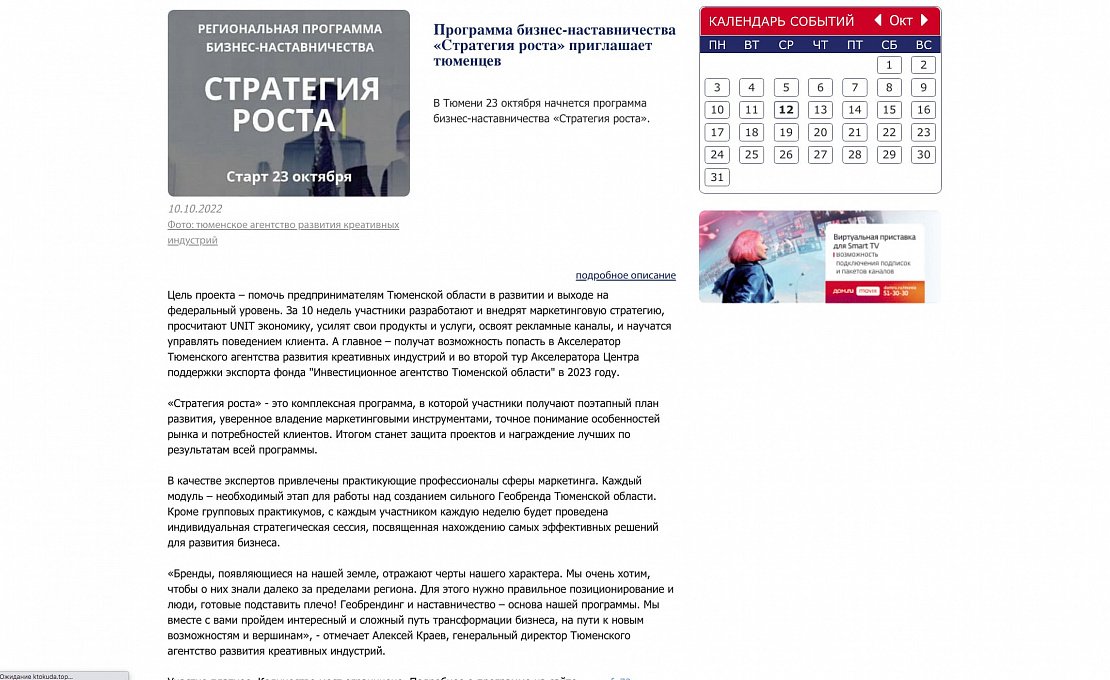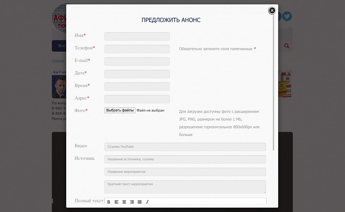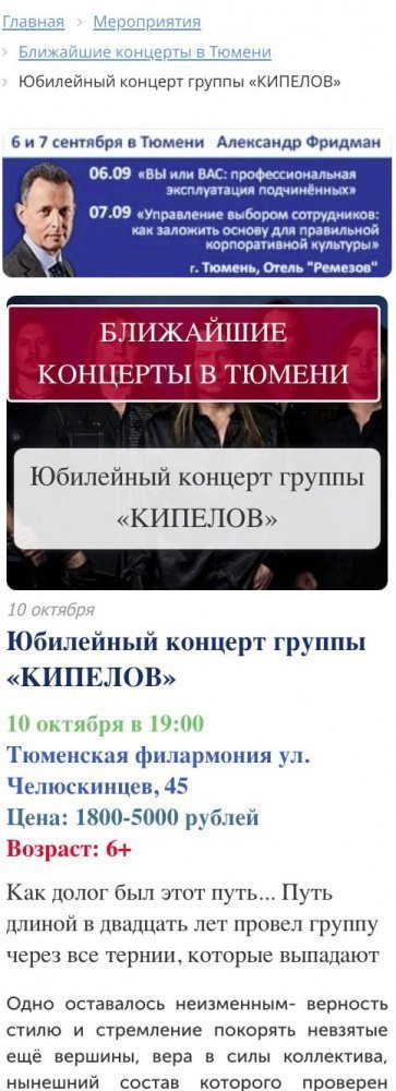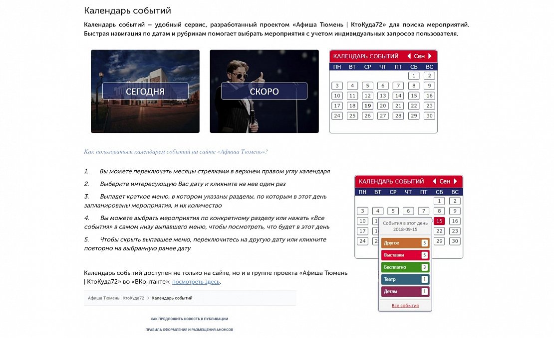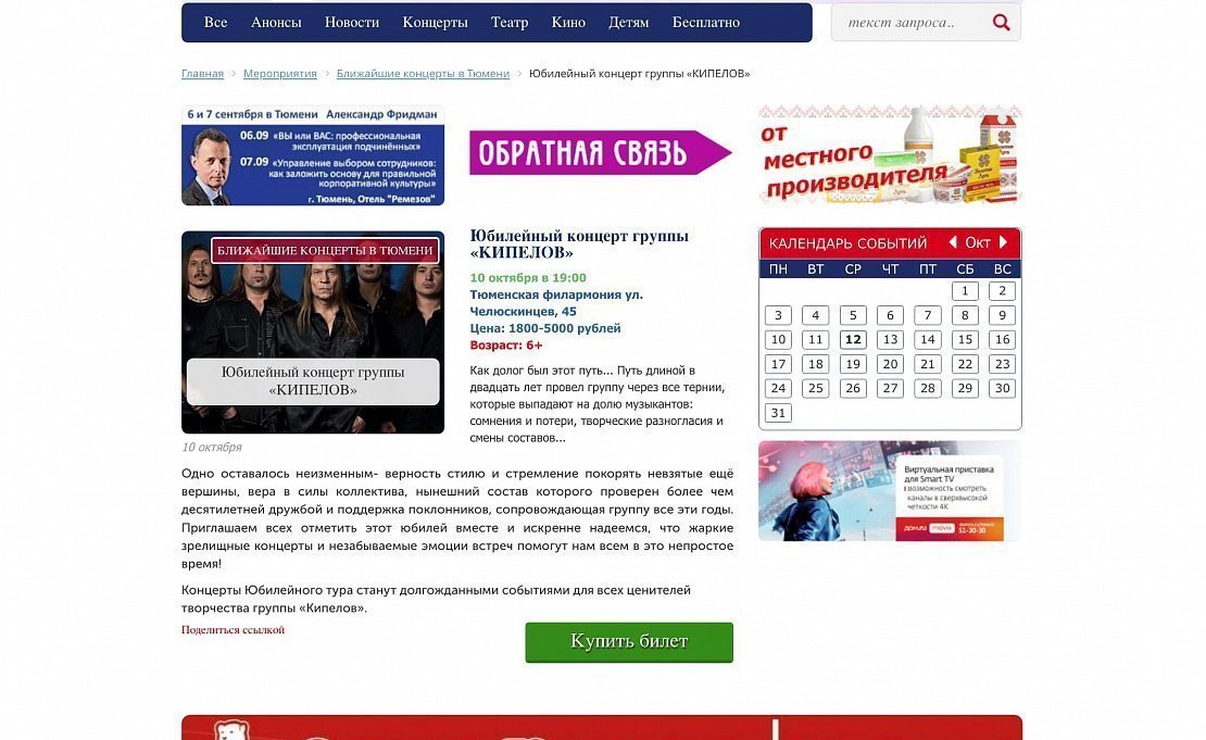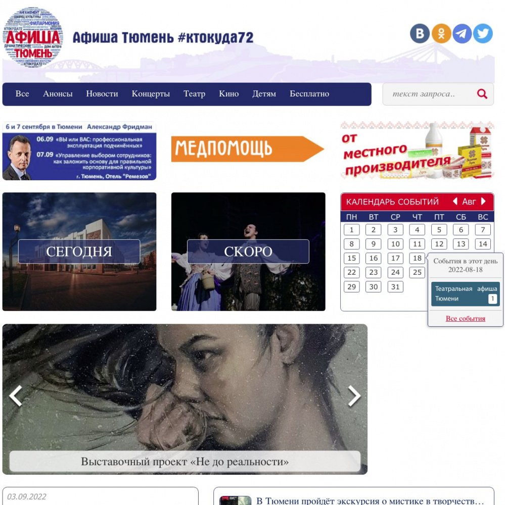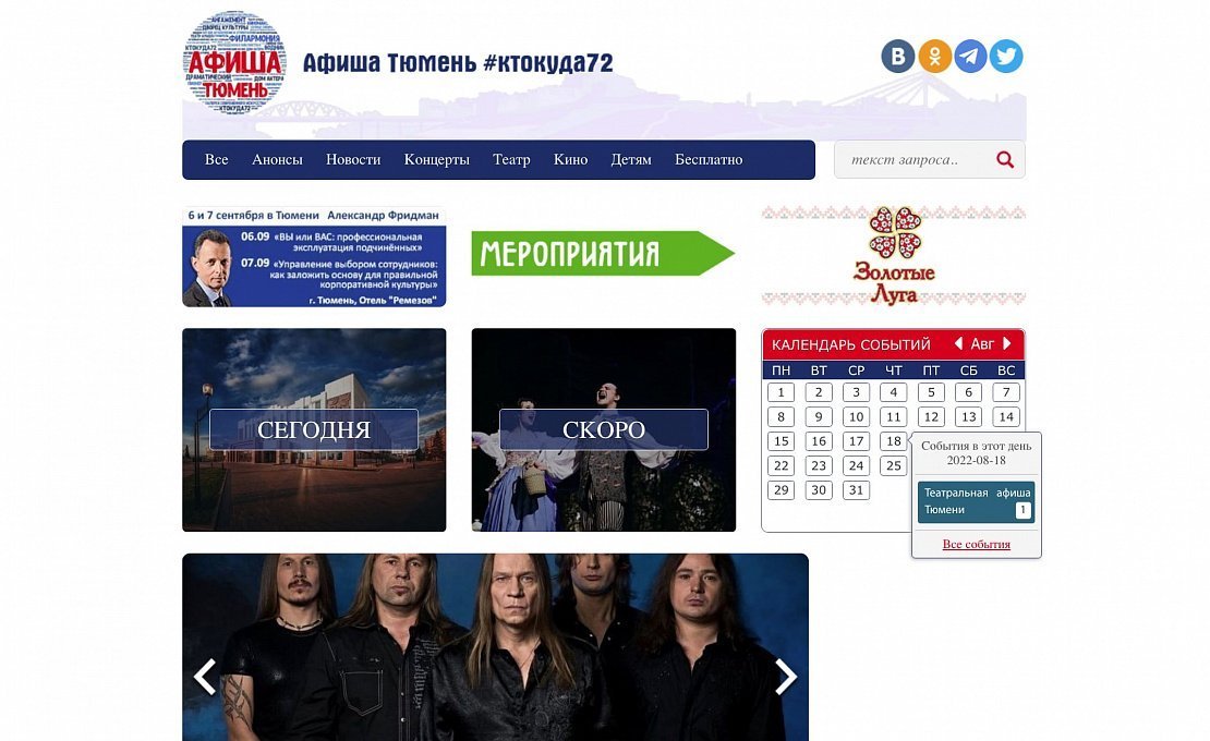 «Афиша Тюмень» рассказывает о культурных, спортивных, массовых и иных мероприятиях региона. Проект «Афиша Тюмень» - одна из самых крупных и популярных площадок для освещения культурной жизни в Тюменской области! Здесь можно увидеть фото и видеоотчеты с мероприятий, анонсы, топы, рецензии, киноновинки, а также принять участие в розыгрыше бесплатных билетов.