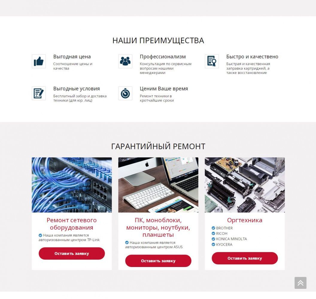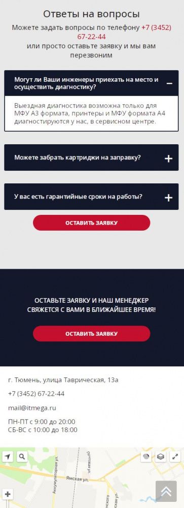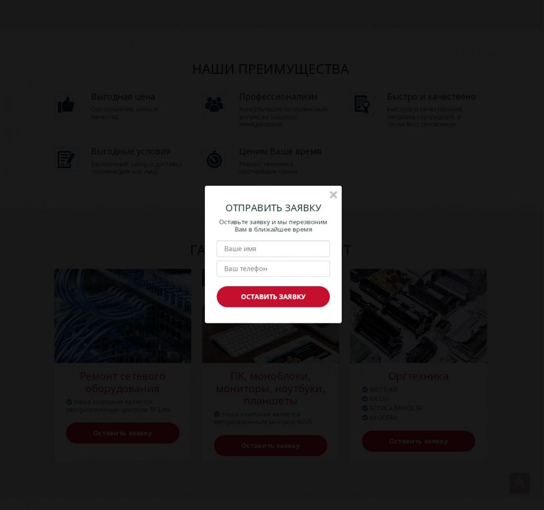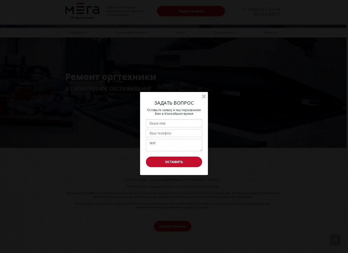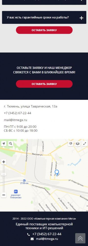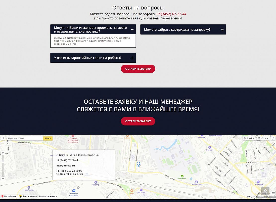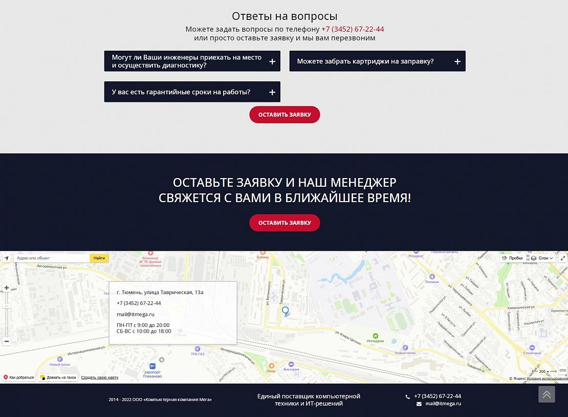 На посадочной странице размещена детальная информация по предоставлению услуг. При заполнении формы связи данные сохраняются в качестве заявки в панели администрирования, а также дублируется на электронную почту компании. При выборе услуги выполняется переход на информационную страницу с детальной информацией о стоимости и сроках предоставления услуги.