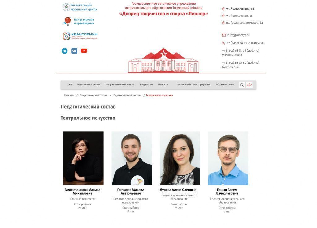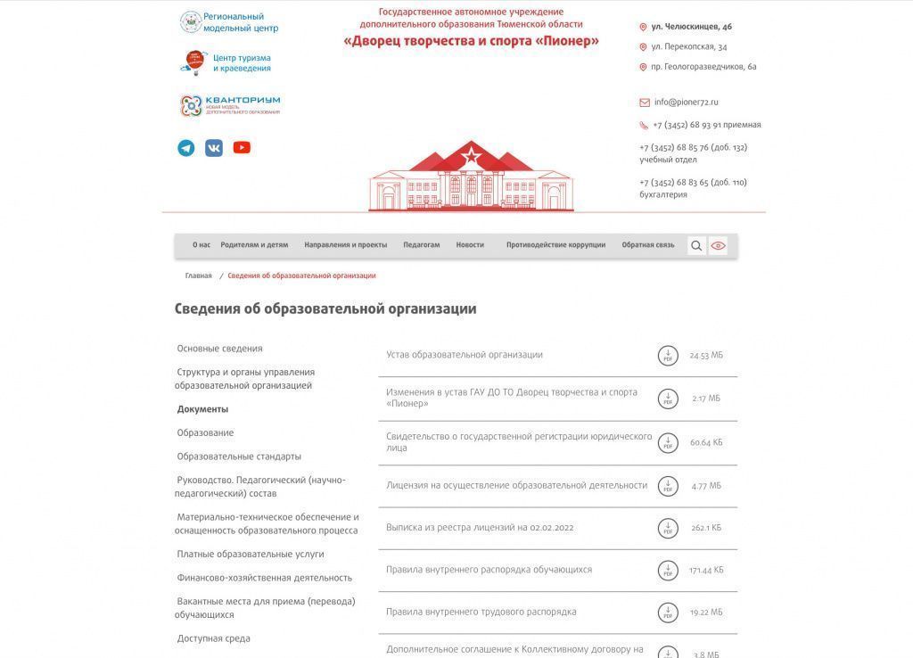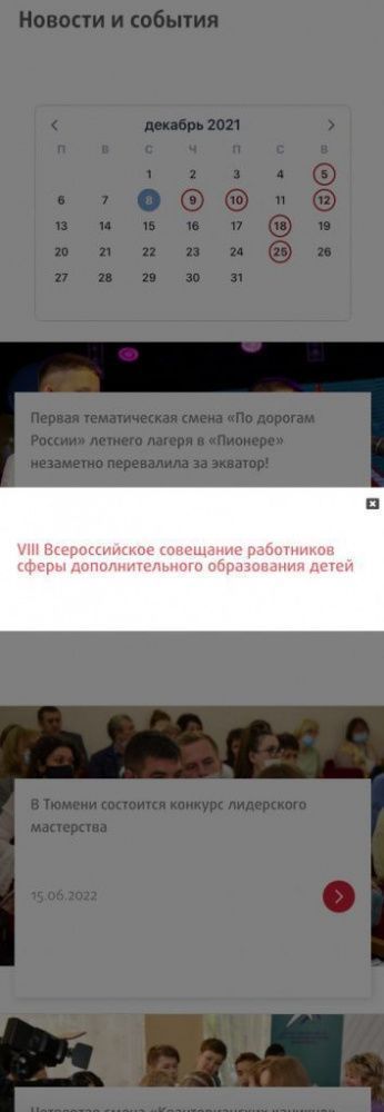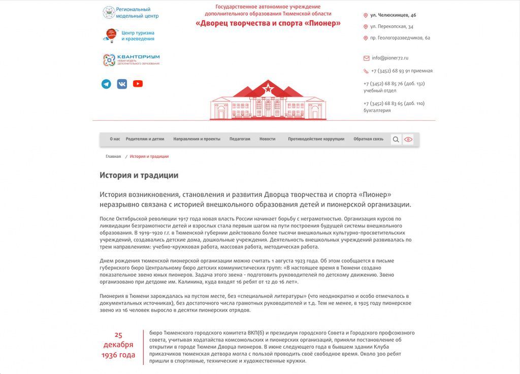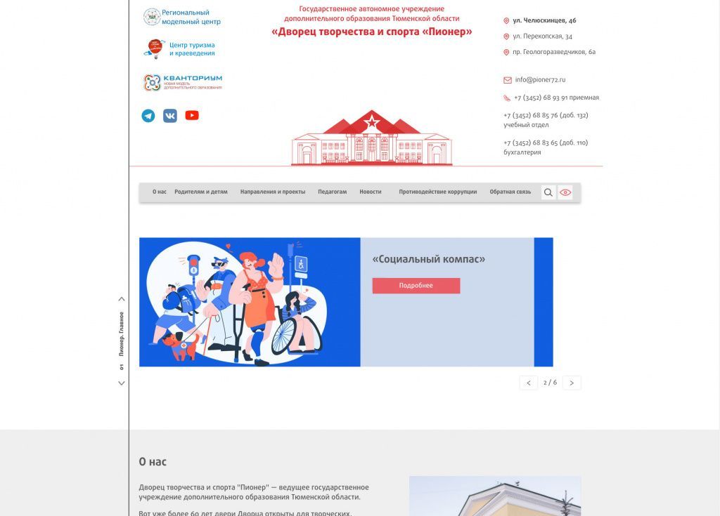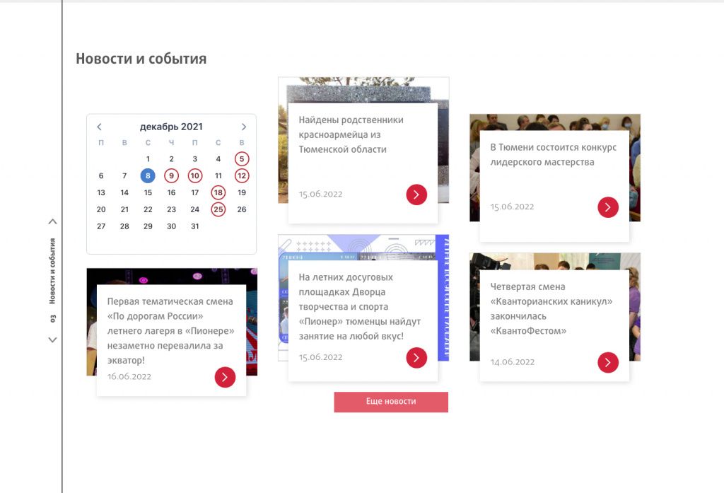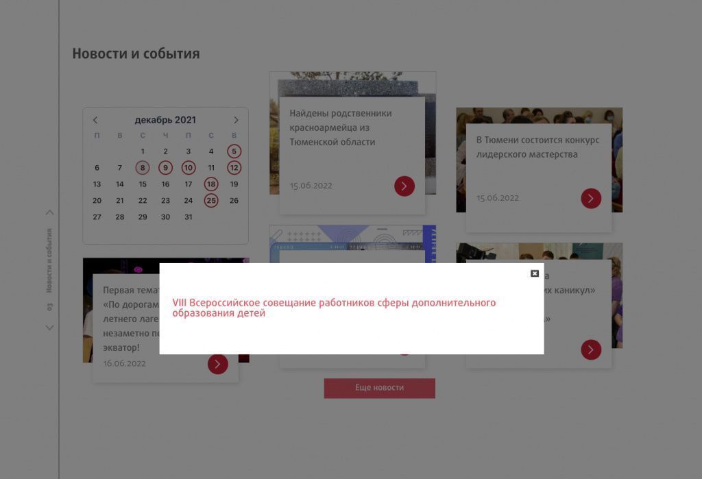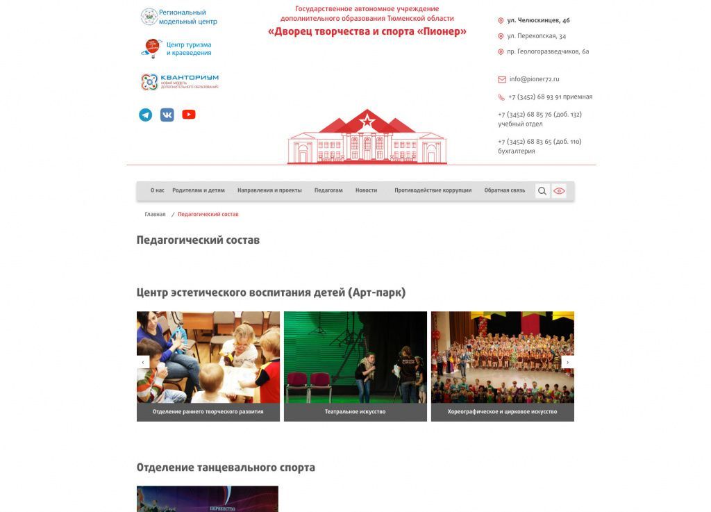 В ходе редизайна важно было акцентировать внимание на мероприятия, которые проводит учреждение. При разработке сайта на главной странице был размещен календарь, внутри которого можно разместить неограниченное количество мероприятий. Дата, в которую назначено какое-либо мероприятие, выделяется красным цветом. При клике на дату видно наименование мероприятия и ссылка для перехода как на внутренний источник, так и на внешний. В разделе документации создана структура в соответствии с требованиями, также в разделах представлены отделения и центры для обучения. В разделе педагогического состава все сотрудники отображаются в соответствии с отделением.