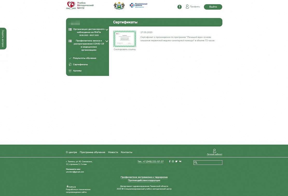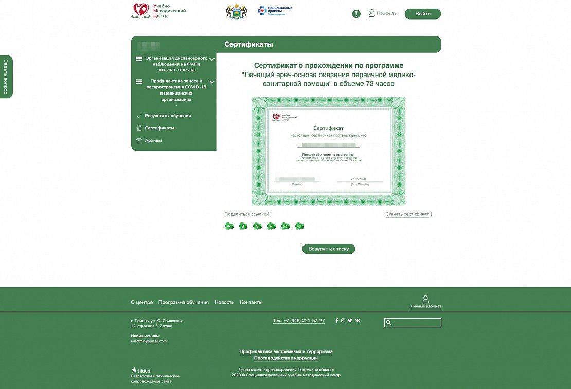 После успешного прохождений цикла обучения для каждого специалиста в автоматическом режиме формируется соответствующий сертификат, который доступен для скачивания из личного кабинета.